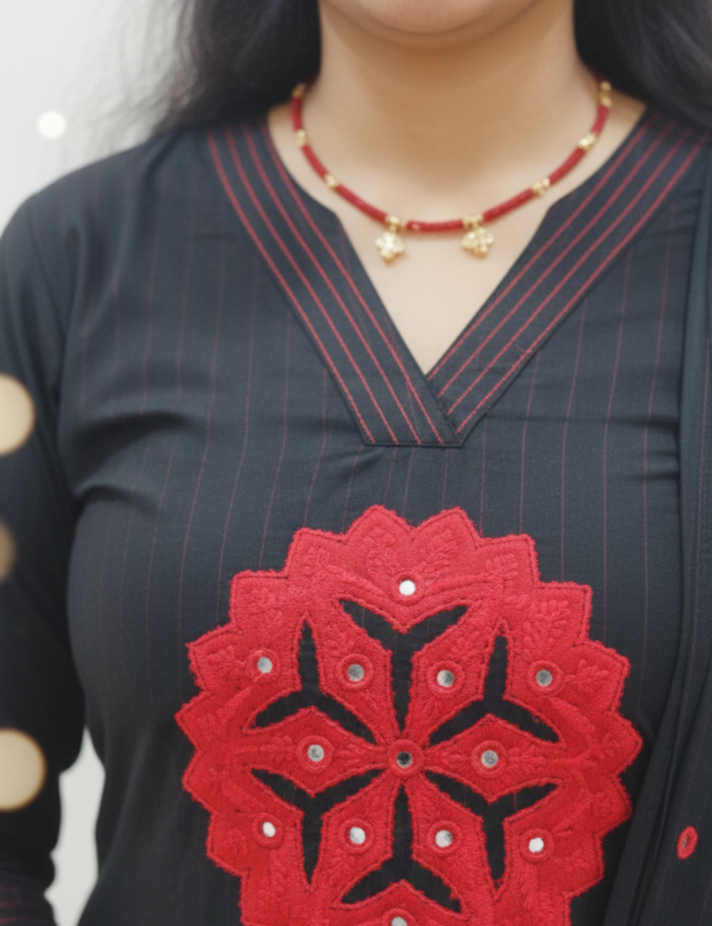 The deep black base beautifully highlights the red appliqué work, adding a handcrafted touch and a vibrant pop of colour to the ensemble. The appliqué detailing enhances the kurta with character and ethnic charm, creating a look that feels both traditional and contemporary.