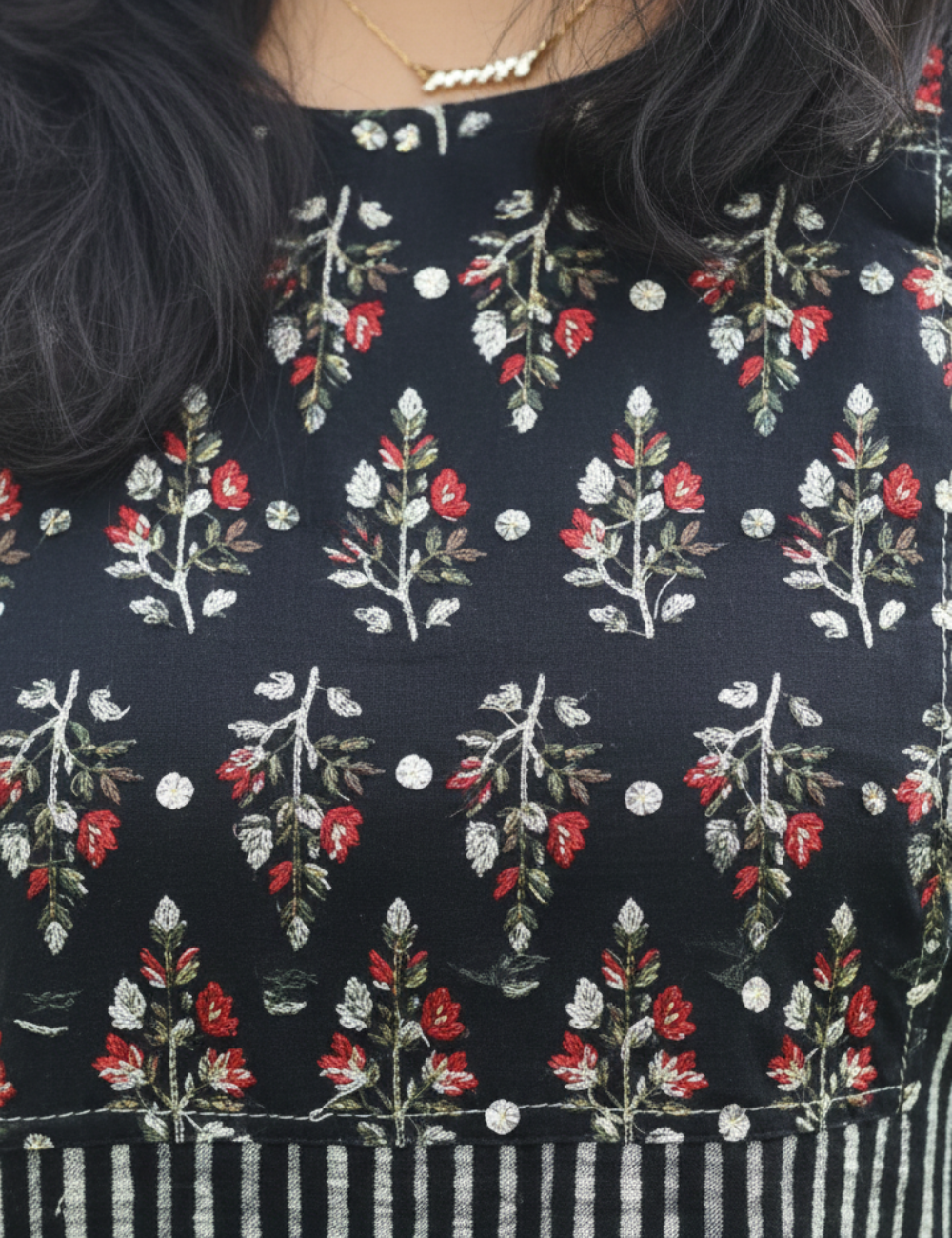 The classic black base beautifully highlights the intricate heavy yoke work,this kurti is perfect for festive gatherings, family functions, office ethnic days, and special occasions. Pair it with straight pants, palazzos, or leggings to create a polished ethnic ensemble.
