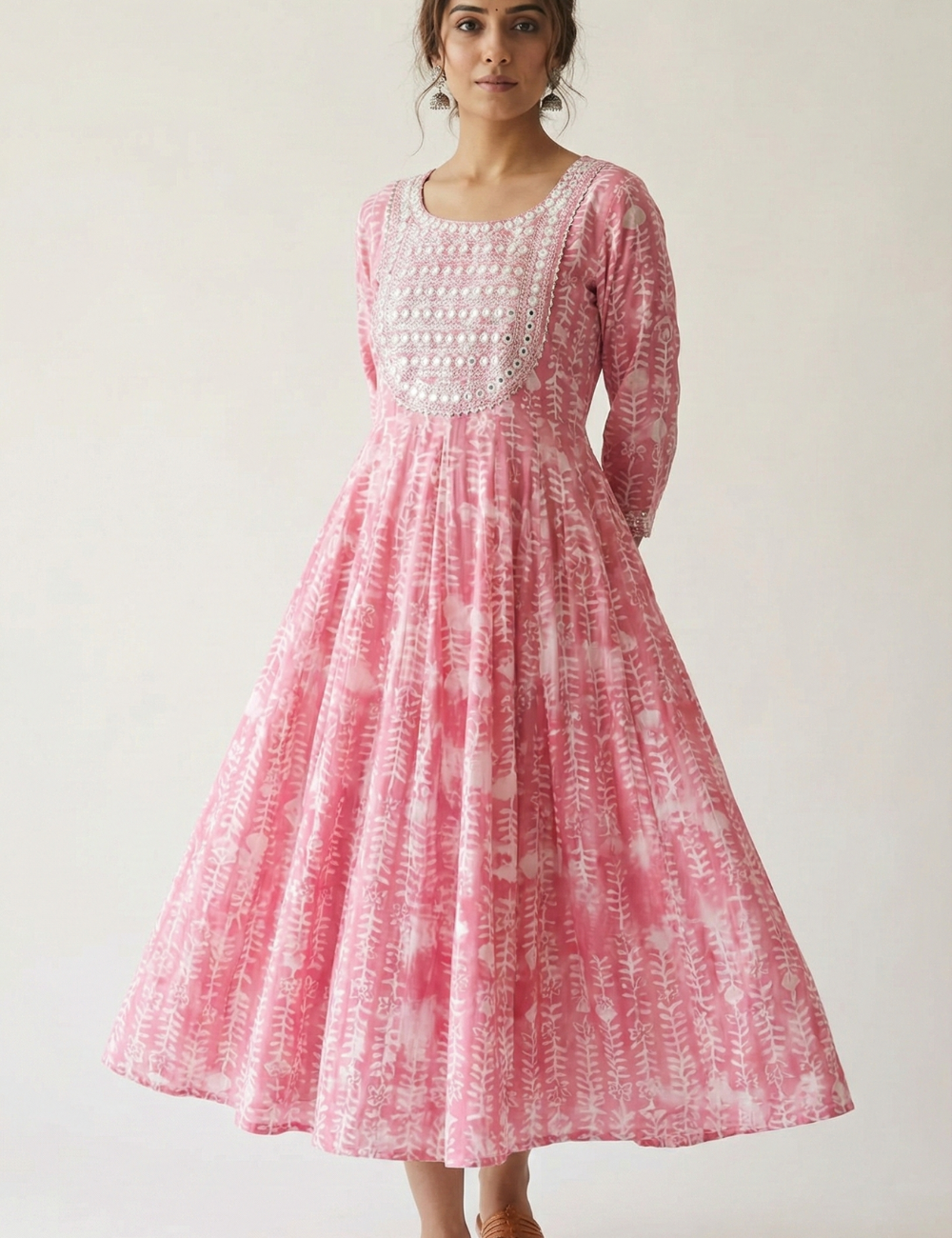 Add a touch of soft elegance to your ethnic wardrobe with this Pink and White Umbrella Kurti, designed to offer flowy comfort with refined detailing.
